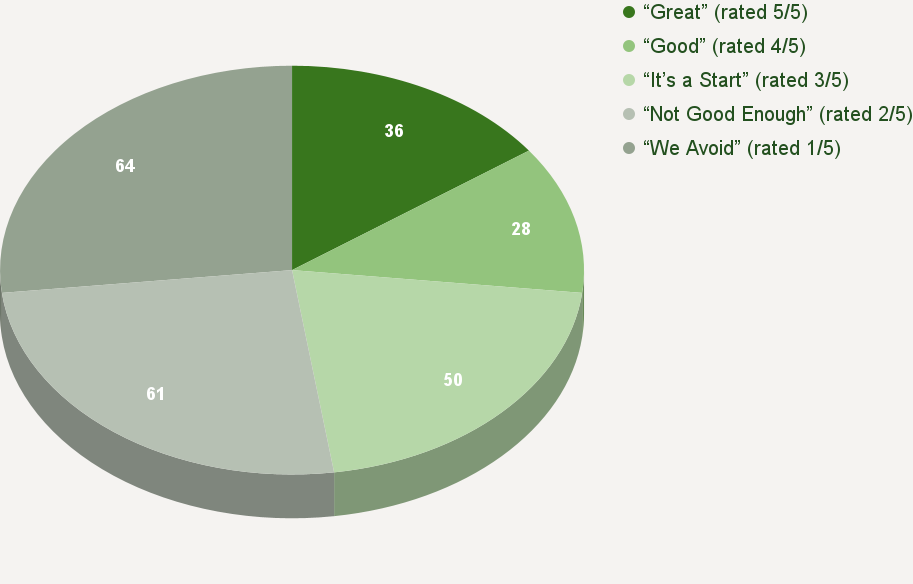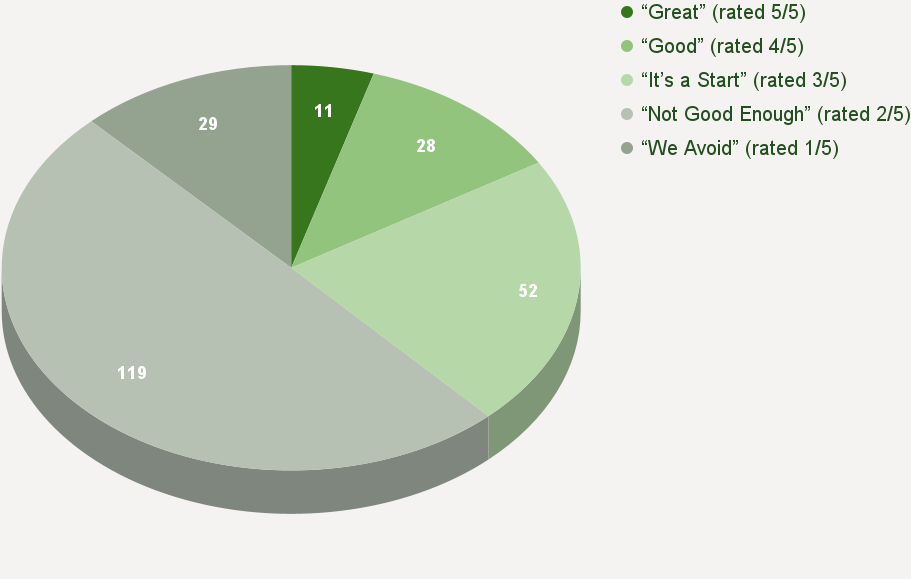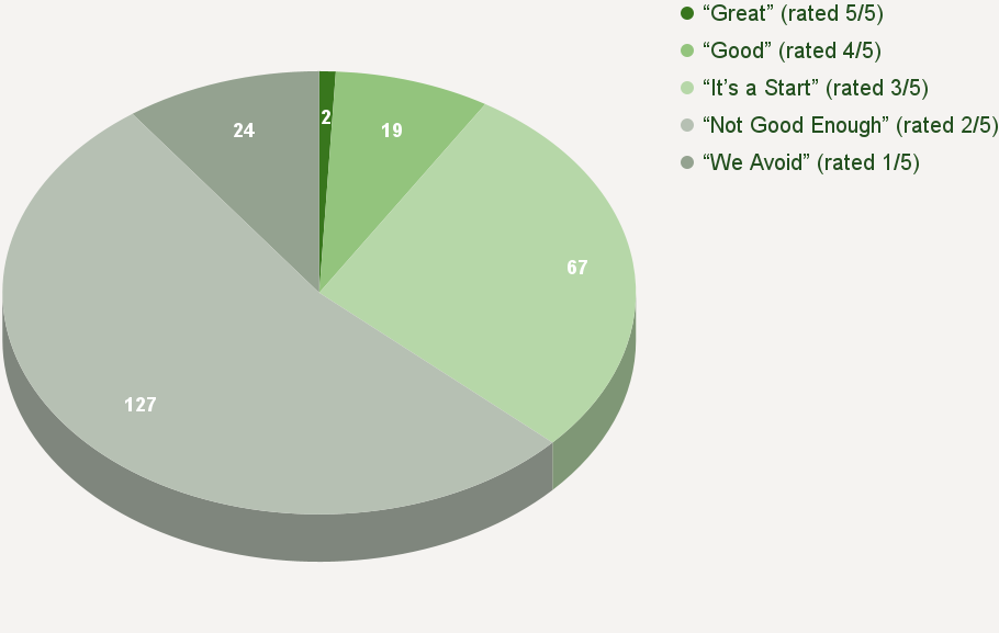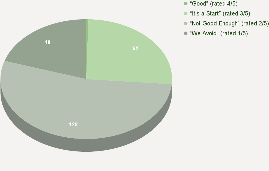 The following table and chart show the distribution of 239 beauty brands, large and small, based on the five-point rating scale (ie graded on the curve). Unfortunately, the largest slice of the pie is rated “Not Good Enough” (2/5), indicating the industry lags when it comes to meaningful sustainability.